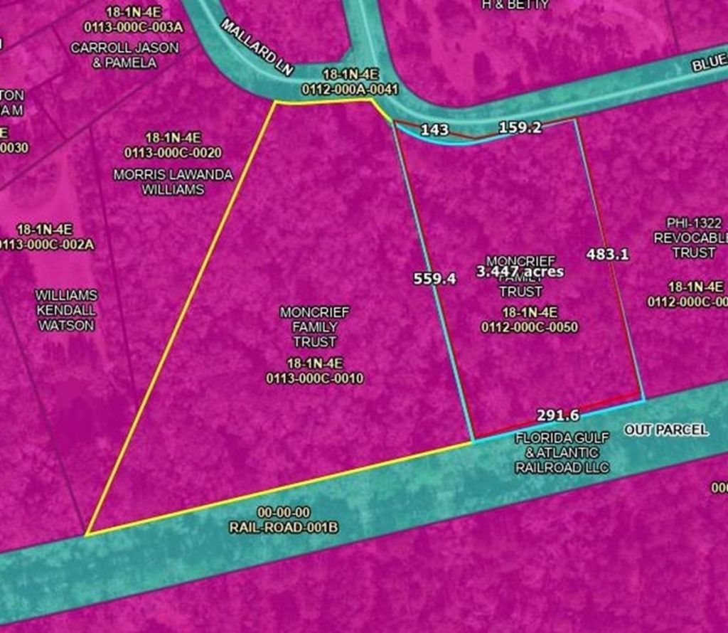 The listing contains (2) adjacent raw land parcels in the Lloyd Acres Subdivision = 9.96 acres total. See parcel IDs: 18-1N-4E-0113-000C-0010 (6.41 acres; Mallard Lane) + 18-1N-4E-0112-000C-0050 (3.55 acres; Bluejay Rd). Look for real estate signs (2) to help identify the acreage for sale. The property is zoned Residential-01 (1 home/1 acre), making it a great opportunity for someone wanting to subdivide, or those looking for a multi-generational property to accommodate several residences for family. Mobile homes are allowed. There are currently no utilities in place; electric, well & septic will be required. *Property is subject to a drainage easement over and across the easterly 15.0 ft.**Note - Dimensions shown are for the Mallard Ln parcel only.