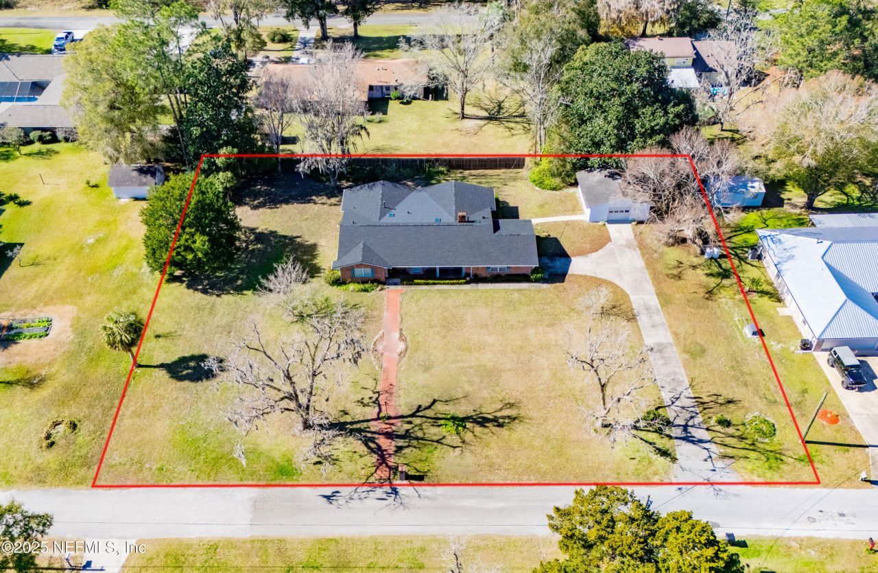 This 3-bedroom, 2-bath brick home offers 2,359 sq. ft. of charm and functionality. Enter through the foyer into a thoughtfully designed layout. To the right, a cozy library with custom cabinetry awaits. A casual dining area flows into the galley kitchen with custom cabinets, a butler's pantry, and a nearby laundry room. The formal dining room connects to a spacious living room featuring a cozy fireplace. Down the hall, find a guest bathroom, two bedrooms, and the primary suite with his-and-her closets and a walk-in shower. The heated and cooled sunroom is a showstopper, boasting a built-in hot tub, wet bar, and plenty of space to entertain. Timeless details include solid wood doors throughout. Roof and water heater recently updated. Outside, enjoy an attached garage and a detached garage/workshop, offering ample storage. With great bones, this home offers incredible potential to create modern touches, while preserving its timeless character. Easy commute to Gainesville & Jacksonville.