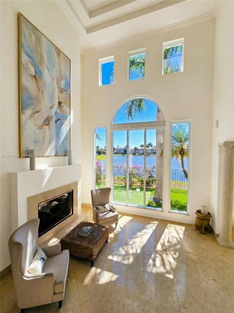 Elegant two-story courtyard estate in guard-gated The Oaks. This 6BR/6BA + 1HB residence showcases 30-ft ceilings, Saturnia marble floors, impact windows and wide-open DIRECT lake views. Rare within this ~490-home community is the combination of a true pool-centered courtyard, private-entry guest quarters, and an open, direct lake backdrop?features that seldom come together in one property. The primary suite is on the first level and features wood floors, fireplace, dual oversized walk-in closets, and French doors to the heated saltwater pool & jacuzzi. A separate two-story guest house offers 2 ensuite bedrooms with private access, ideal for extended stays or flexible living. Every bedroom includes its own balcony, enhancing the indoor-outdoor feel throughout. Additional highlights include a 3-car garage and resort-style outdoor living designed for entertaining. Recent improvements include fresh exterior paint, refreshed landscaping (bougainvillea/trees), pavers, low-maintenance turf incl. putting green, outdoor kitchen w/ built-in grill, privacy fencing + dog gate, window tinting, whole-home generator, and updated pool equipment. The Oaks resort clubhouse lifestyle with spa services, sauna, fitness center, Pilates and cycling rooms, resort pool with cabanas, on-site dining, 12 tennis courts (stadium/clay/hard), pickleball, basketball, plus childrens playground, arcade room, and indoor/outdoor play areas?close to the Florida Turnpike and Bocas top shopping & dining nearby.