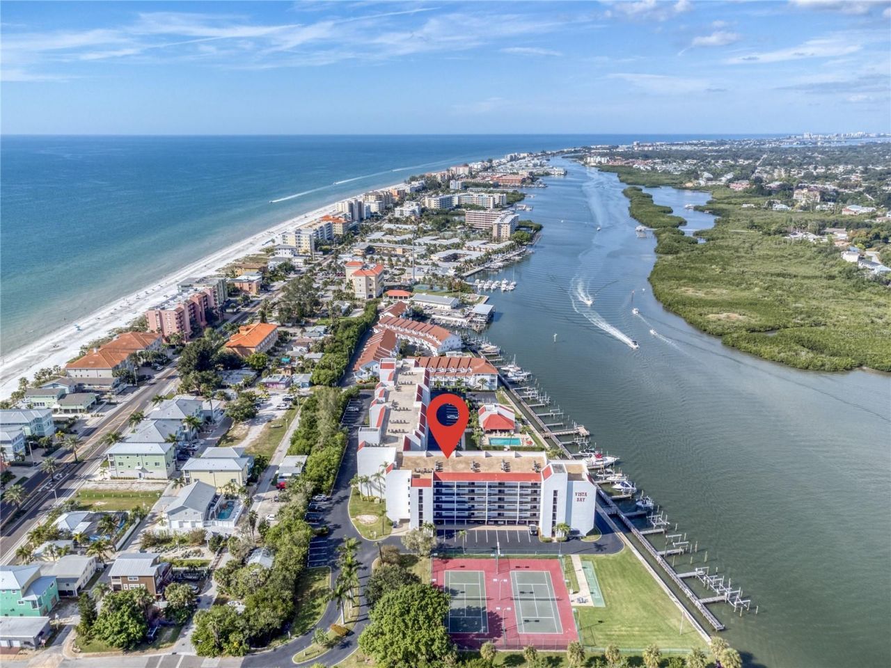 Furnished Waterfront Rental with a boat slip in Indian Shores! Currently tenant occupied, but will be available from April 15, 2026, to January 1st, 2027. Everything but the electric cost is included. Not only is the unit updated and lovely, you will be directly ACROSS THE STREET FROM THE BEACH and you can dock your boat with direct access to the Gulf of Mexico/America! This BEAUTIFUL 2 bedroom and 2 bath condo is located in the Vista Bay Condominiums on Indian Shores, which rests on the Intracoastal Waterway, and is located across the Street from Indian Shores Beach, whose fine white sand has been deemed as one of the loveliest Beaches in the World! Vista Bays unit 510 is 1355 sf and has 2 bedrooms and 2 baths. It is located on the 5th floor; not to worry, there is an elevator! You will have dedicated parking for 2 vehicles just steps from the buildings entry, one space is the under building, with a tandem parking space behind it. Vista Bay has a heated pool, shuffleboard, and 2 tennis courts. The boat dock is new, courtesy of Hurricane Helene! There are 2 private balconies; the Master Bedroom Balcony has a Gorgeous view of the Gulf of Mexico, and the Living Room Balcony overlooks the Intracoastal waterway which flows into the Gulf of Mexico. This Lovely and Spacious Condo sleeps up to 4: a King-Sized Bed in the Master with an ensuite bath, and a Queen-Sized Bed in the Guest bedroom. The Master bath has a walk-in shower, and the Guest bath has a tub shower combo. The lovely and updated kitchen is fully stocked with all you will need to prepare your meals; pots and pans, eating utensils, plates, cups, coffeemaker's (Keurig and regular), and a toaster. The condo is fully equipped with high-speed internet and basic cable, and in-unit laundry. Sorry, no pets or smoking allowed. Sorry, the association does not allow trailers, golf carts, or motorcycles. Just bring clothes and flip-flops! Minimum 6 month lease is required. Don't let this one get away!