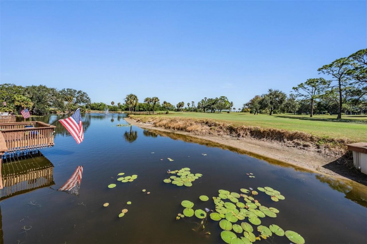 Welcome to one of Cove Cay's coveted seven condos with an oversized outdoor deck-set above a tranquil pond on the 15th hole-where bay breezes and ever-changing views of water, wildlife, sunrises, and golfers become your daily backdrop. The 16' x 13' deck (208 sq. ft.) was rebuilt in 2025 with composite Trex for beauty, durability, and years of low-maintenance living. Wide PGT impact sliders open to a screened porch that flows out to the deck-hello, indoor-outdoor entertaining. Inside, the open kitchen is light and bright, featuring a double PGT impact window, white soft-close cabinetry, exquisite light granite with neutral veining that doubles as an expansive serving/snack bar, a ceiling detail with crown moulding and integrated lighting, stainless appliances, a deep stainless undermount sink with a sleek black gooseneck faucet, decorative backsplash, and a dedicated coffee bar. Pergo DuraCraft waterproof luxury vinyl plank runs throughout for cool comfort, easy care, and long-term durability. Fresh, airy wall colors elevate the spacious living/dining area, which includes an attractive built-in and the perfect wall for a large TV. The serene primary suite enjoys PGT windows framing the pond and golf course. Its en-suite bath offers a large vanity, distinctive lighting, updated tile shower and flooring, and a custom walk-in closet. The second bedroom flexes beautifully as a den, office, or guest room, and the refreshed hall bath is another win. Practical perks abound: a 2023 Trane A/C, a newer water heater, hurricane windows throughout and your own private laundry room just steps from the front door with full-size washer/dryer, storage cabinet, and high shelving. This corner residence adds privacy and sits just moments from the Village 2 pool and recreation area-as well as your carport. Lush landscaping, shimmering water and fairway vistas, 24/7 security, and well-kept amenities make this the paradise known as Cove Cay.