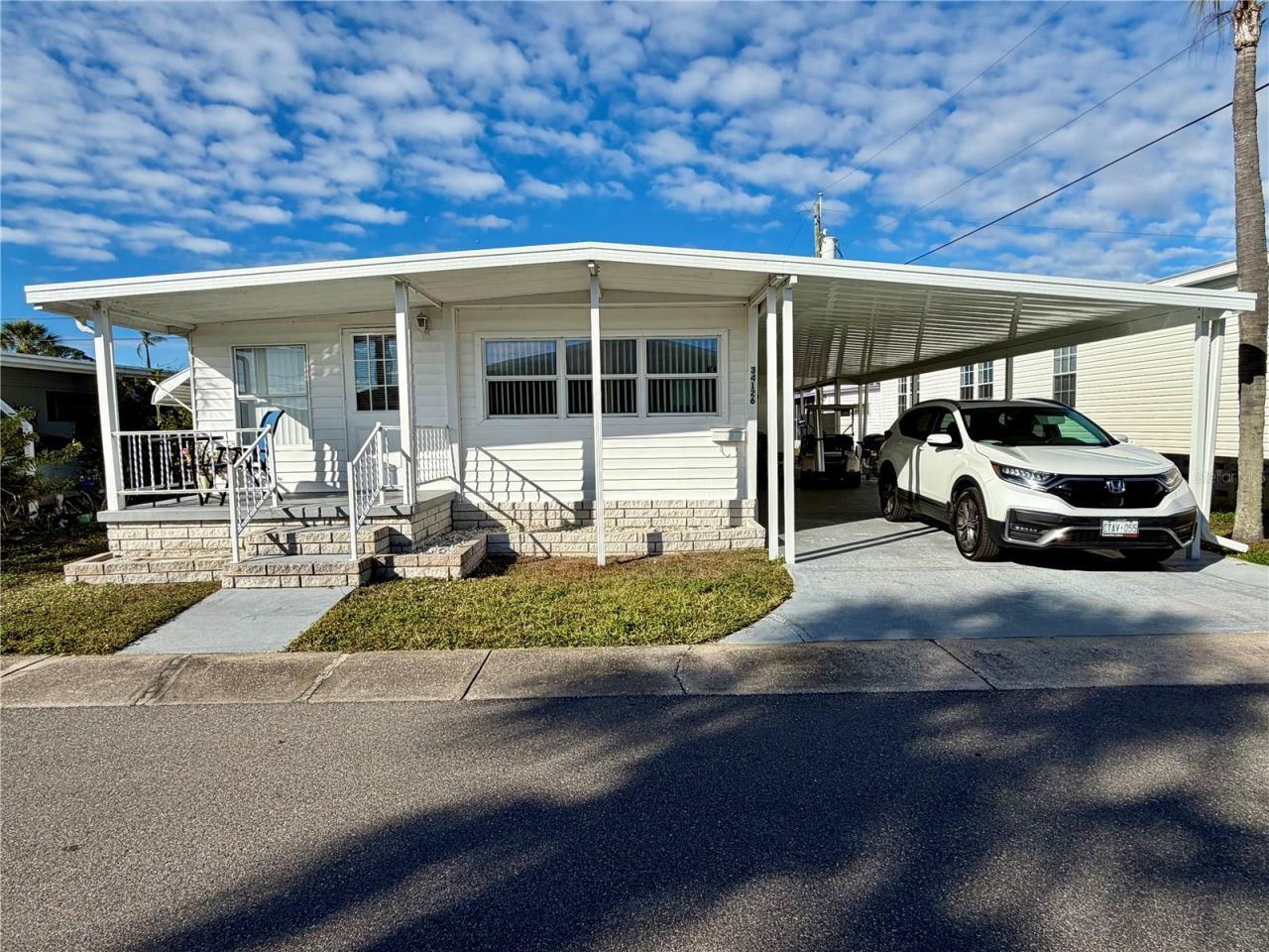 YES this price DOES include the Share valued at $55,000... 2 beds, 1 bath home with a new (12/24) oversized carport, good size living space, updated bathroom, lots of extra storage space in home and an eat in kitchen. The Front windows have recently been replaced and are double pane. 2nd bedroom closet was turned into an inside laundry with some hanging space and storage as well. All windows in the home have blinds. Roof was replaced approx 5 yrs ago. MUST SEE, this home is priced to SELL QUICKLY! Very affordable park, monthly HOA is ONLY $210 per month which includes WATER, SEWER, and TRASH, owned clubhouse, escrows are fully funded, beautiful heated pool and spa, fitness center, library, shuffleboard, billiard table, grounds maintenance, and a small lake at the back of the park, laundry room, and your very own private entrance to the SUPER WALMART... on foot, bicycle or golf cart... Etc., etc. Sunset Palms is in close proximity to the beaches, airports, I - 275, churches, restaurants, all kinds of shopping, etc.... Seller is leaving a golf cart for the next owner (needs a battery), other than that, it works.