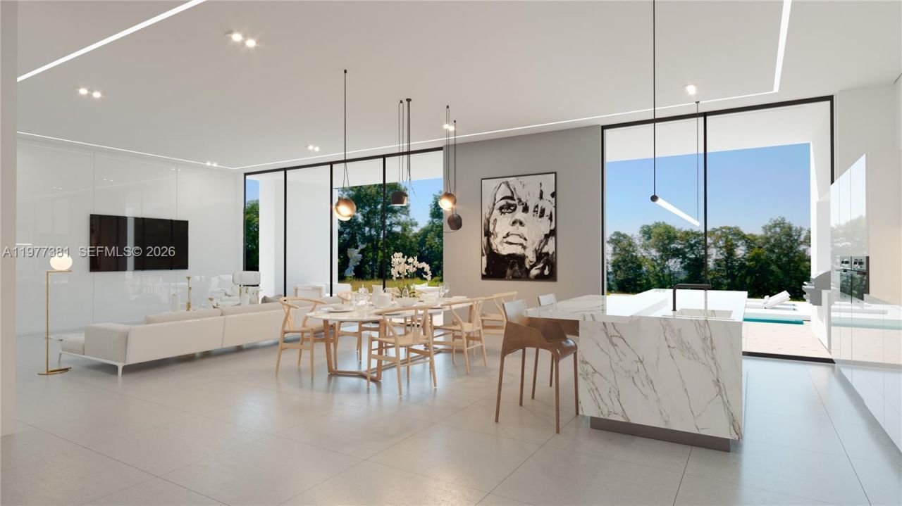 Discover this stunning new construction home in North Bay Village, thoughtfully designed for modern living. The residence features five spacious bedrooms, five full bathrooms, and an additional half bath across 4,410 square feet of beautifully crafted space.The sleek contemporary exterior is complemented by expansive windows that flood the home with natural light. Inside, the open-concept layout is highlighted by floor-to-ceiling glass walls that showcase lush greenery and create seamless access to the private pool and patio?perfect for relaxing or entertaining guests.Clean architectural lines run throughout the home, while the kitchen serves as a true centerpiece with a striking marble island and elegant fixtures that add a touch of everyday luxury. On track for April 15th completion.