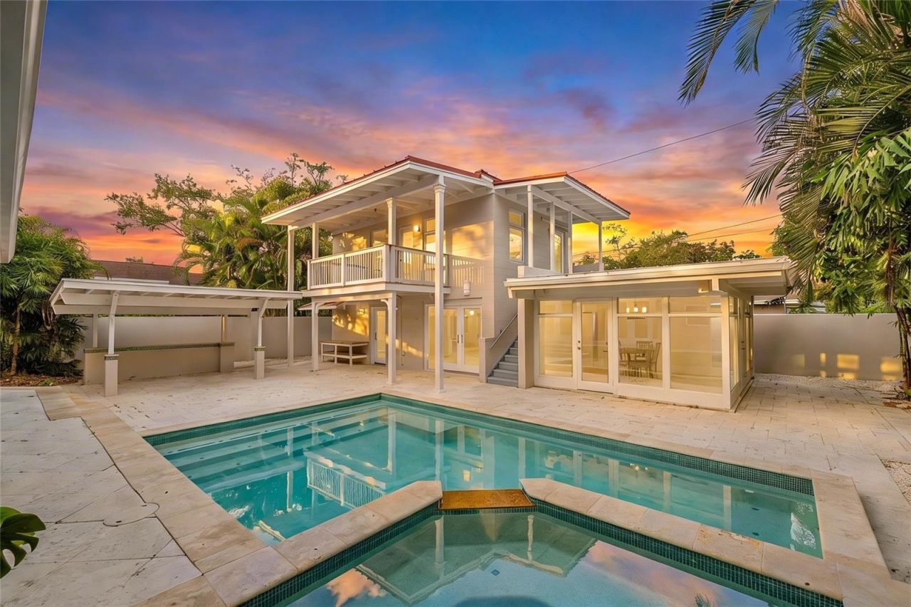 One or more photo(s) has been virtually staged. Timeless architecture meets thoughtful luxury in this beautifully restored 1938 estate, tucked within one of St. Petersburg's most sought-after neighborhoods. Blending original character with refined upgrades, this property offers privacy, versatility, and exceptional indoor-outdoor living. The main residence features vaulted beamed ceilings, a stunning new gas fireplace, and warm gathering spaces that feel both versatile and inviting. The chef's kitchen is designed for everyday ease and entertaining alike, showcasing quartz countertops, ceramic tile backsplash, gas range, generous cabinetry, and seamless flow to the dining area. A butler's pantry, laundry room, and guest bath add convenience, while two bedrooms each include their own stylish en-suite bath with walk-in tiled showers. A private courtyard becomes your personal retreat complete with pool and spa, more than 1,500 sq. ft. of travertine pavers, and a 14x16 covered patio ideal for dining, lounging, and entertaining. Lush tropical landscaping and a 6-foot block privacy wall create a true sanctuary.The separate guest house enhances the property's flexibility, offering two additional bedrooms with en-suite baths and walk-in closets, plus an office/studio with floor-to-ceiling windows overlooking the pool - perfect for remote work, fitness, or creative pursuits. Notable improvements include moisture-resistant materials such as Purple board and Hardie board in key areas, new plumbing in the walls, upgraded subflooring with vapor barrier and plywood, durable waterproof wiring beneath the home, new interior doors throughout, a brand-new gas fireplace, and a new AC system complemented by mini-splits for added comfort and efficiency. Together, these upgrades enhance durability while preserving the home's historic charm. Located just minutes from Downtown St. Petersburg's waterfront parks, dining, marinas, boutiques, and arts scene, this estate delivers the rare combination of heritage, design, and convenience. Homes like this are seldom available. Is this home your perfect match?!